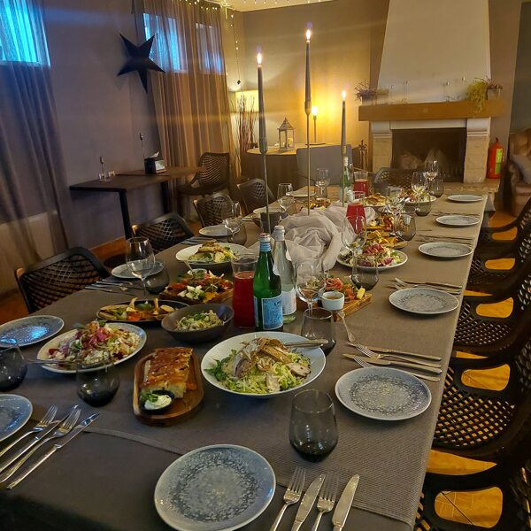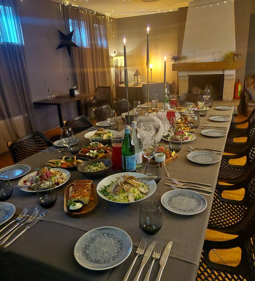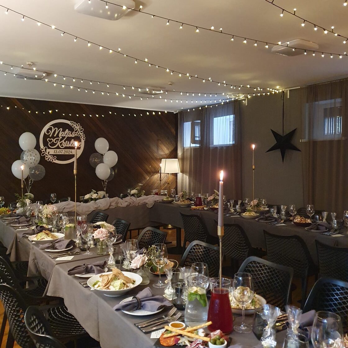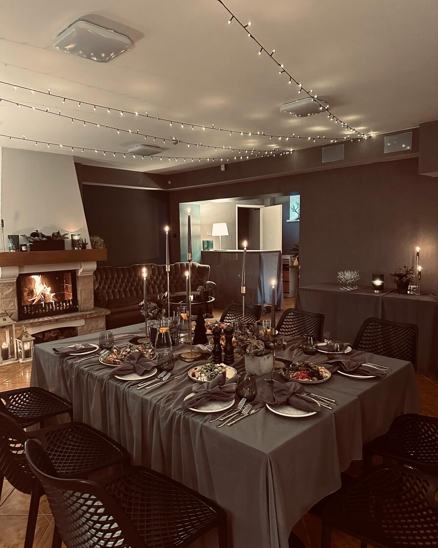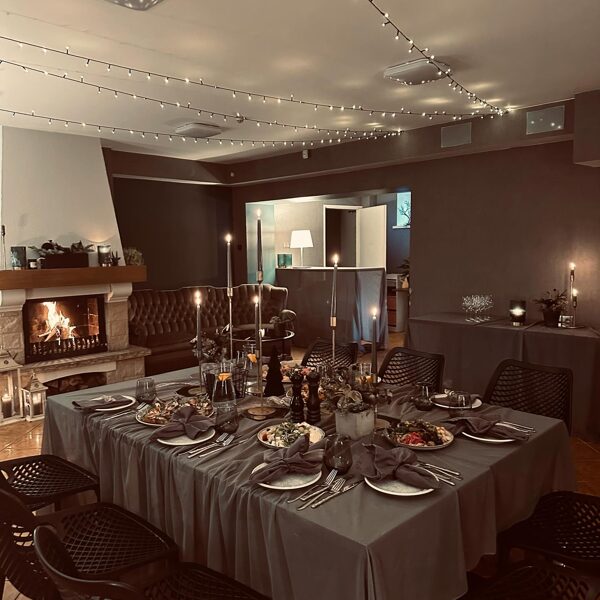 - Atsevišķa banketu telpa ar kamīnu. Bērnu stūrītis blakus